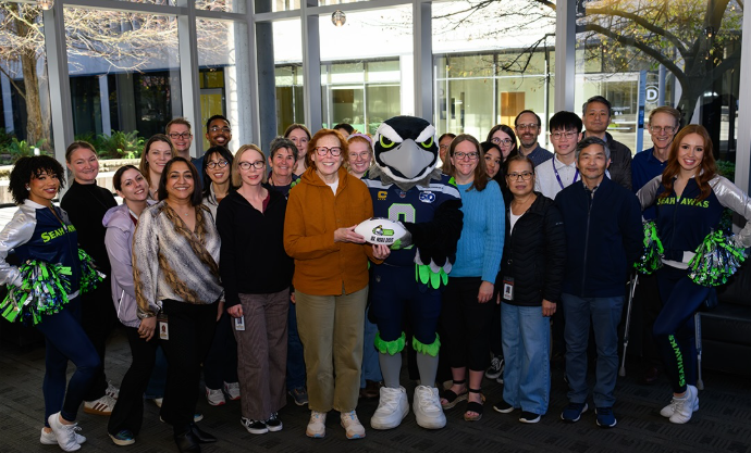 The event was a complete surprise for Dr. Disis – and her reaction was one of genuine astonishment and delight. Adding to the excitement, Blitz the Seahawks mascot and two Seahawks dancers joined the celebration, bringing energy and joy to the lab. Blitz was a hit with everyone, especially when he got to play in the lab and even peer through a microscope. Alongside the Seahawks and Delta representatives, Blitz also toured the lab, learning firsthand about the groundbreaking research taking place.